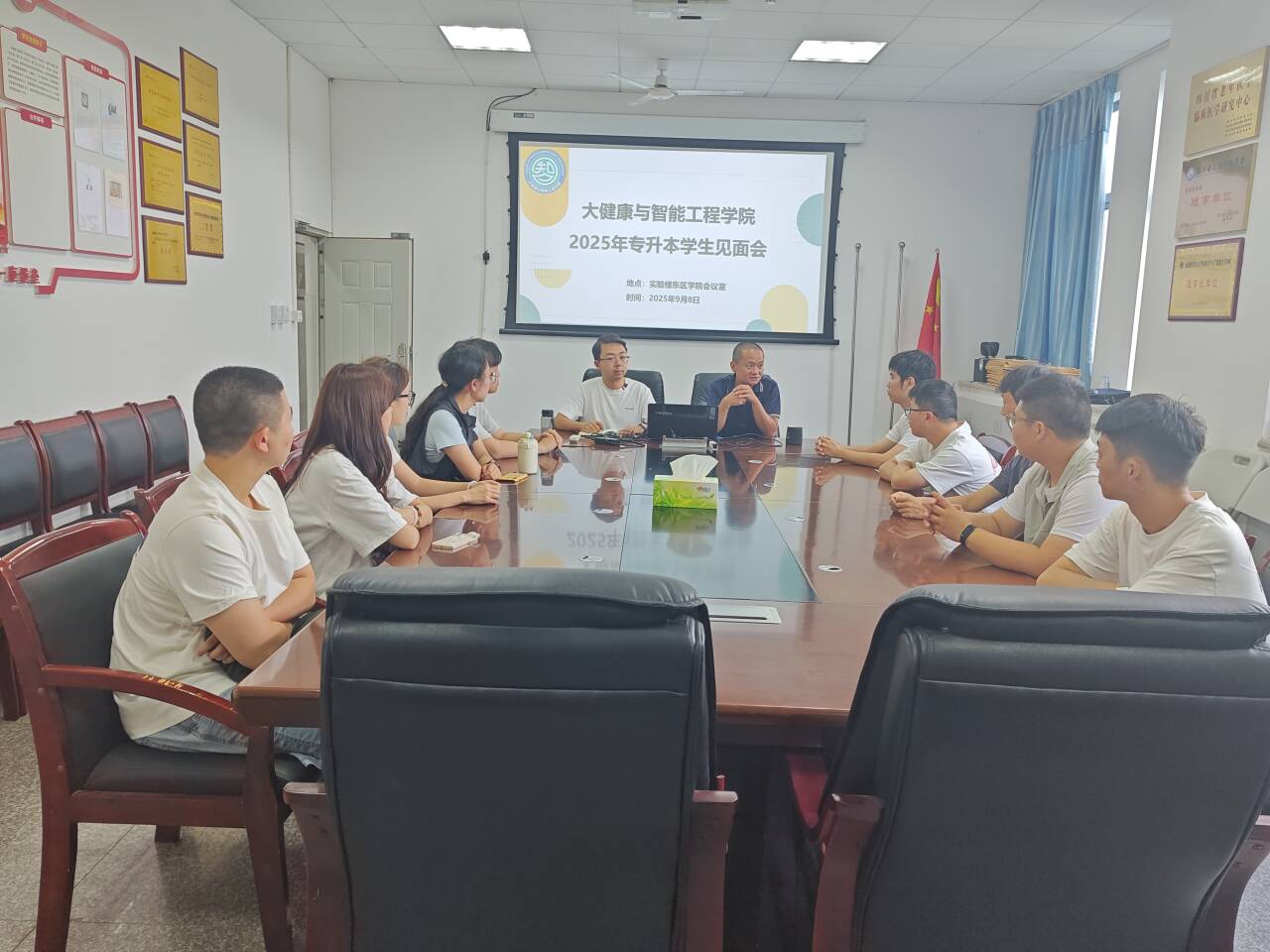 为助力专升本学生明确学业目标、适应校园生活,9月8日17时,大健康与智能工程学院在学院会议室召开2025年专升本学生见面会。学院党委副书记吴培培、教务科科长张建炜、学生科科长罗艳荣、辅导员及专升本学生参会。