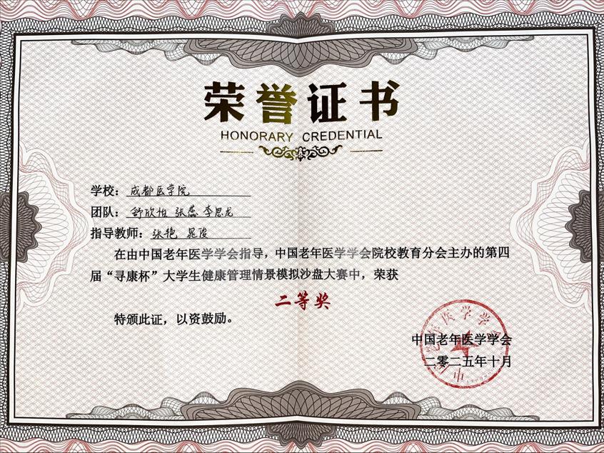 在此次全国高水平比赛现场中,成医学子凭借扎实的专业功底、清晰的逻辑思维和默契的团队配合,在情景模拟推演、方案汇报、沙盘竞技等环节中展现出过硬的实践能力与良好的综合素养,其呈现的健康管理方案兼具专业性与可行性,赢得了评委专家的一致认可,最终脱颖而出,斩获二等奖的优异成绩。