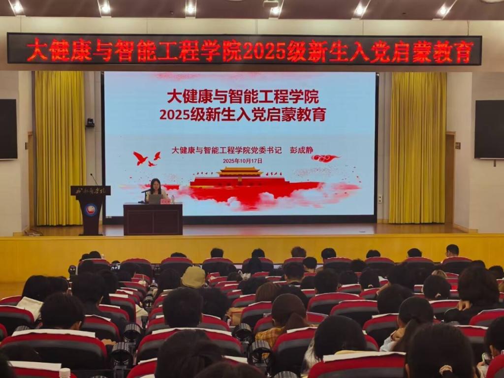 为加强新生思想引领,夯实理想信念基础,引导新生端正入党动机,大健康与智能工程学院于2025年10月17日在学术交流中心举办了面向2025级新生的入党启蒙教育。学院党委书记彭成静担任主讲人,为全体新生带来了一场富有教育意义的专题党课。