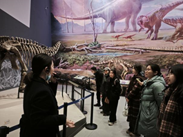 活动现场,师生党员与团员代表循着自然演化脉络,依次走进地质环境厅、矿产资源厅、龙行川渝厅、探秘恐龙厅、生命探源厅等特色展厅,开启科普研学之旅。龙行川渝厅与探秘恐龙厅内,合川马门溪龙化石巍然矗立,光影复原场景生动再现远古风貌,深化生命演化认知。生命探源厅的展陈脉络,则让师生深刻体悟生物多样性与生态和谐的重要意义。